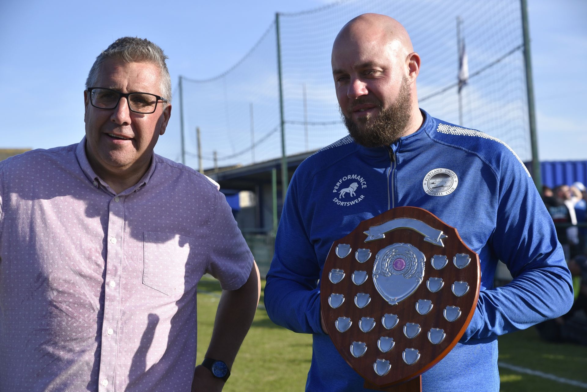 Main Photo: Robin Caddy | Above: Portland Manager, Kyle Critchell with the play-off trophy, alongside Chairman, Matthew Lucas (left) (Michelle Carr)